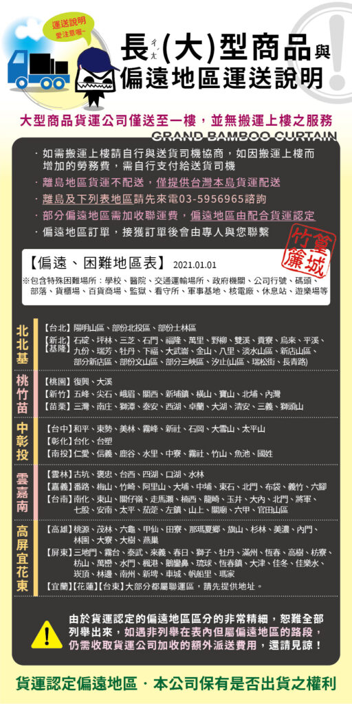 商品訊息長(ㄔㄤˊ)型/大型商品與偏遠地區運送說明 Posted on 2021-01-072021-01-07 by 篁城test 07 1 月 藝FUN卷–竹文化館竹之旅,有FUN卷.真好玩….藝術/旅遊/伴手禮一次滿”竹”. 【2025春節休假公告】