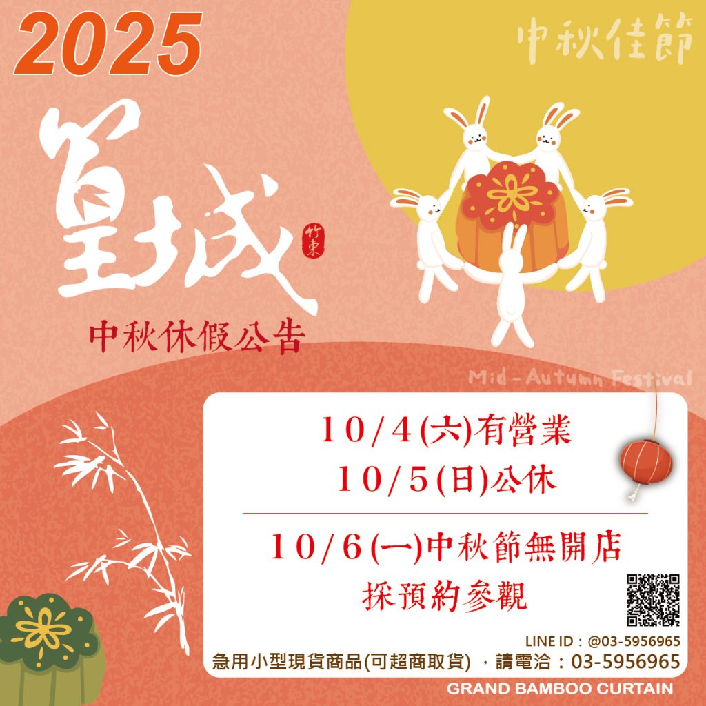 活動訊息2025【中秋休假公告】 Posted on 2021-09-142025-10-03 by 篁城test 14 9 月 2025【中秋休假公告】10/4(六)有營業10/5(日)公休————————————————-10/6(一)中秋節無開店採預約參觀 服務專線03-5956965 (安心得來速 -涼涼~宅在家 爽爽防疫 )台灣Fighting…篁城與你一起安心防疫 【2025國慶營業公告】