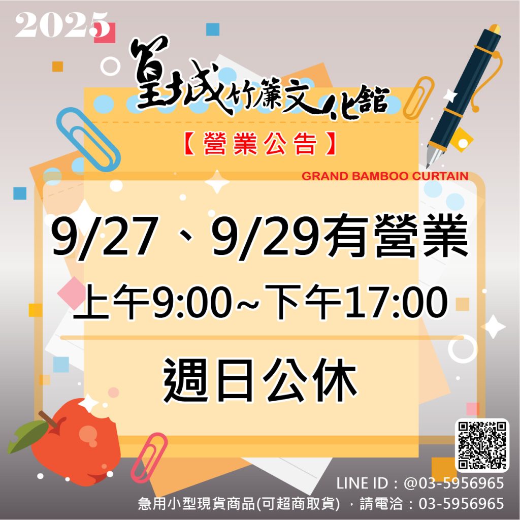 活動訊息2025【教師節-營業公告】 Posted on 2024-11-222025-09-26 by 篁城test 22 11 月 2025【教師節-營業公告】 9/27、9/29有營業 上午9:00~下午17:00 – 週日公休 – 服務專線03-5956965 2025【光復節營業公告】