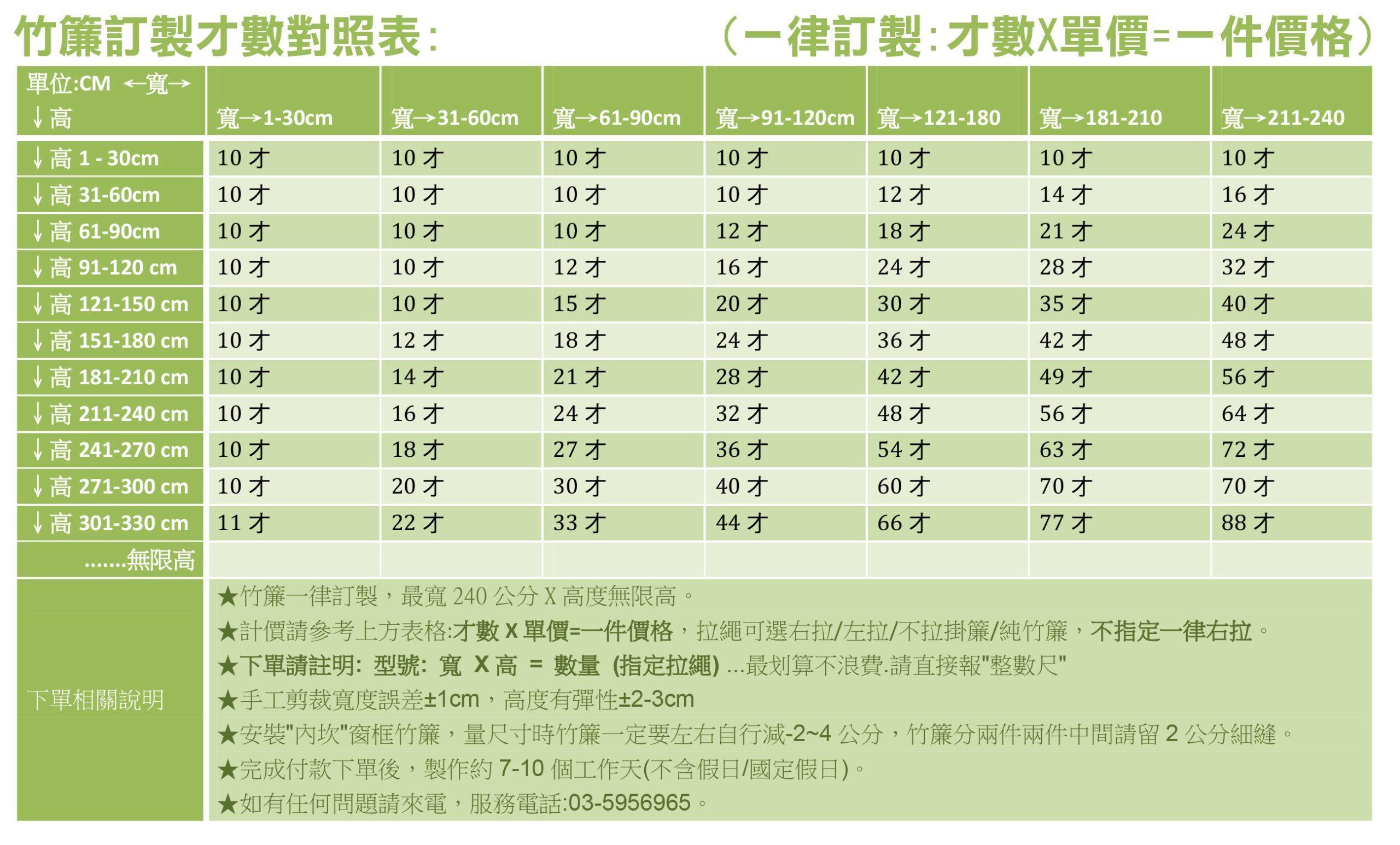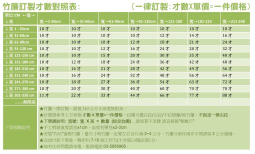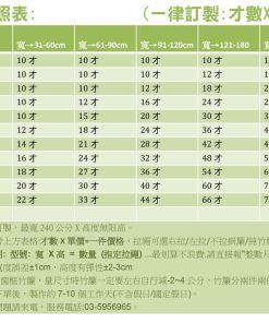 一才:83元 說明: ★下標方式:請下標數量 = 實際訂製才數的總數量。 ※竹簾寬寬短短:寬幅(超過180cm)較寬才數未滿35才有材料加長費用一件200元※ |