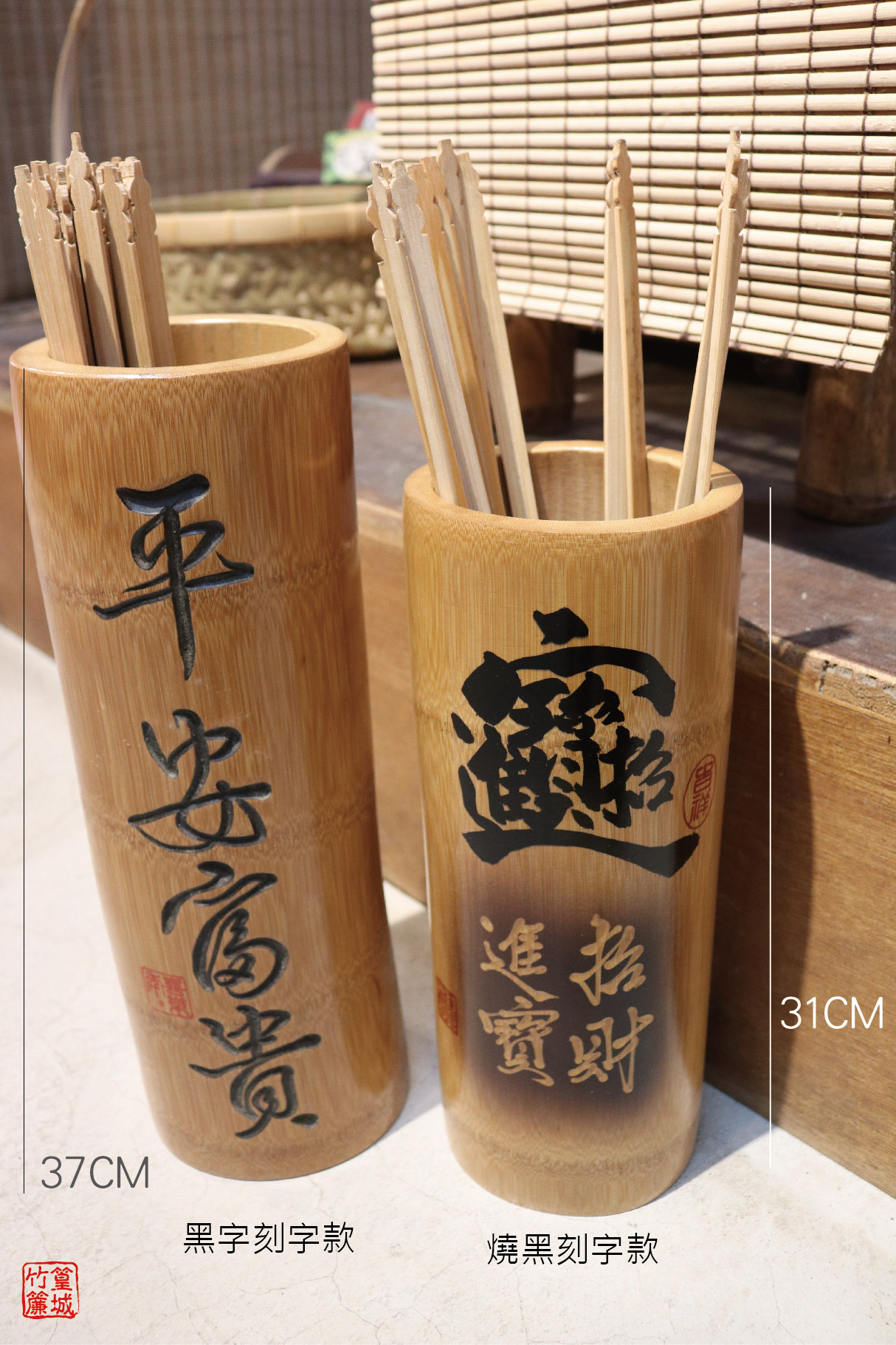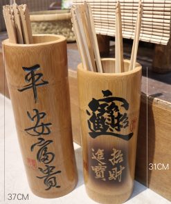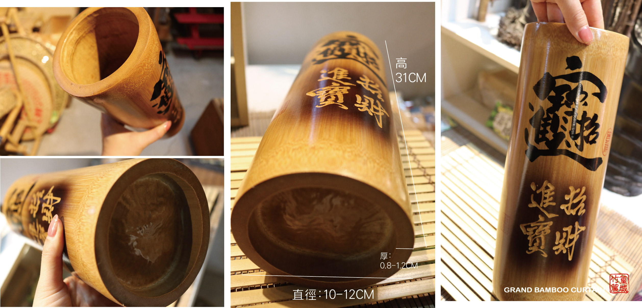 ● →直徑:約10-12公分 ● →厚度:約0.8-1.5公分 ● →高度:31公分 ±1cm -竹筒有”節”內徑高度約只有約27-29公分 (此網頁:招財進寶:書法+燒黑+刻字陰雕.只有這款)) |